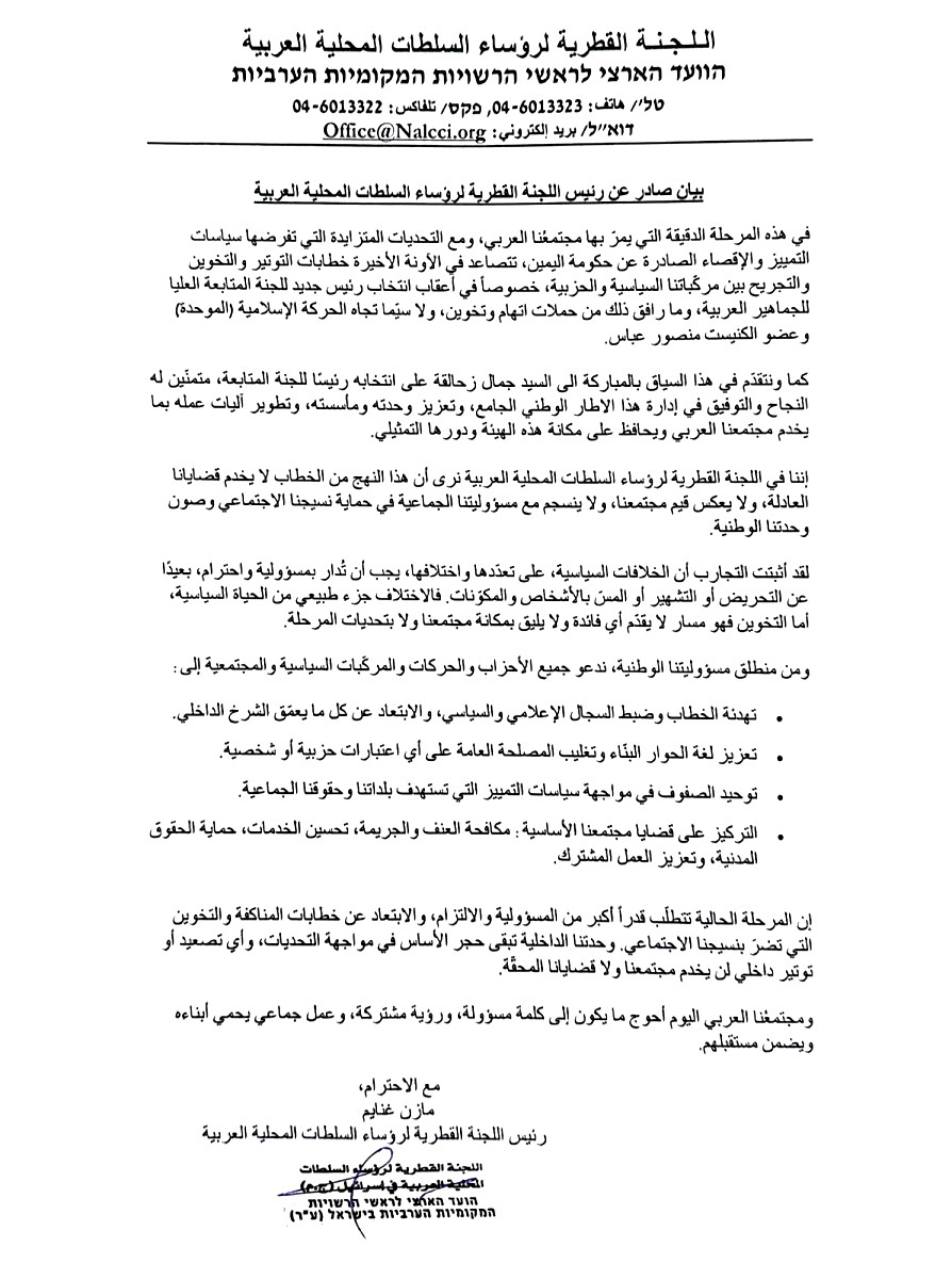 إننا في اللجنة القطرية لرؤساء السلطات المحلية العربية نرى أن هذا النهج من الخطاب لا يخدم قضايانا العادلة، ولا يعكس قيم مجتمعنا، ولا ينسجم مع مسؤوليتنا الجماعية في حماية نسيجنا الاجتماعي وصون وحدتنا الوطنية.