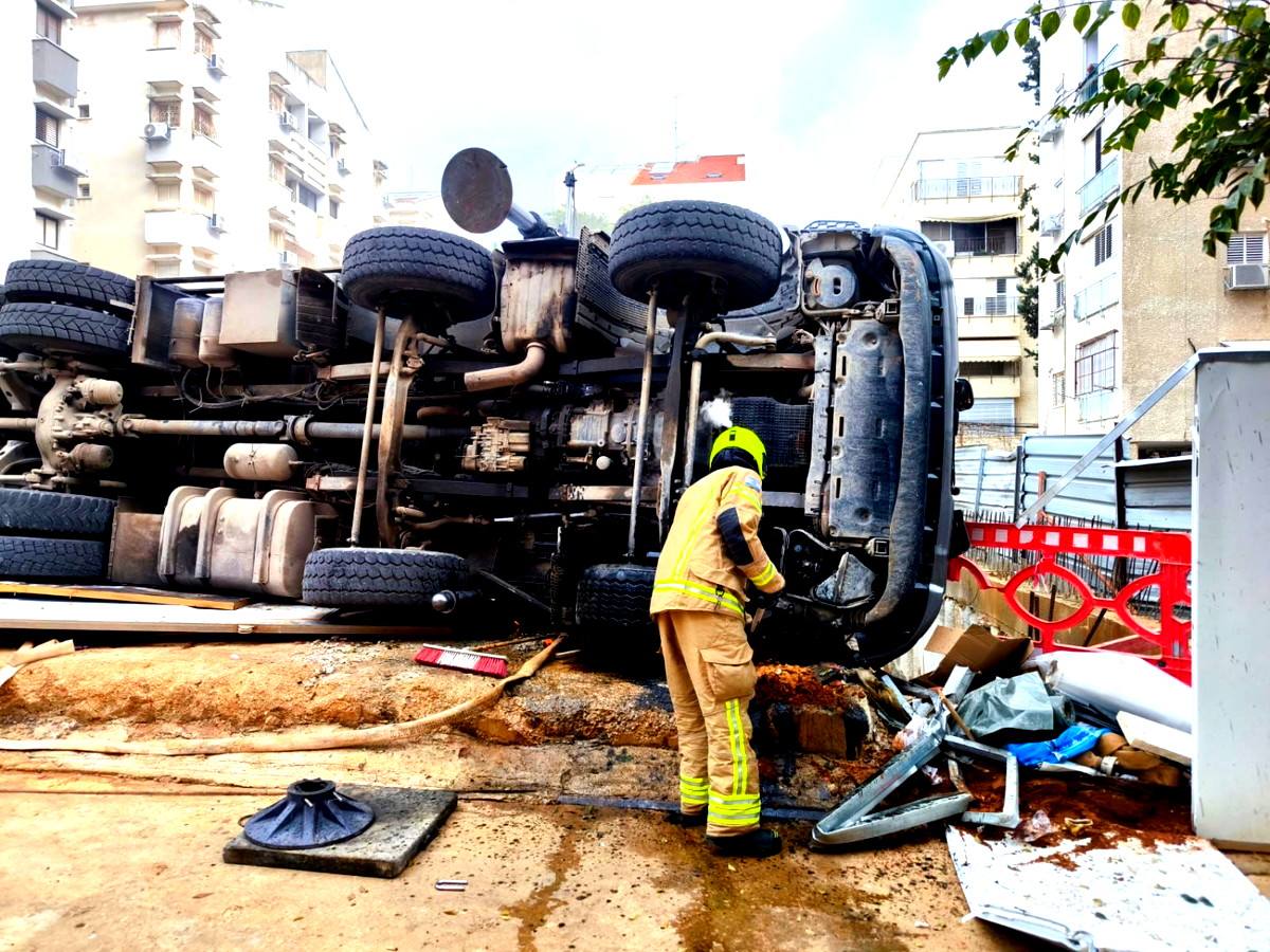 بالفيديو: انقلاب شاحنة داخل ورشة بناء في كفار سابا... لا يوجد إصابات في المكان