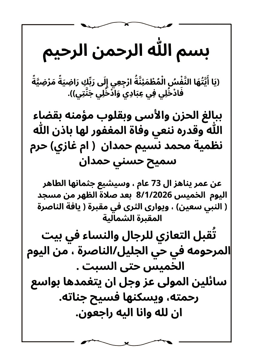 توفيت في الناصرة نظمية محمد نسيم حمدان (أم غازي) عن عمر ناهز الـ73 عامًا. وسيشيع جثمانها الطاهر اليوم الخميس 8.1.2026 بعد صلاة الظهر من مسجد النبي سعين، ويوارى الثرى في مقبرة يافة الناصرة (المقبرة الشمالية).