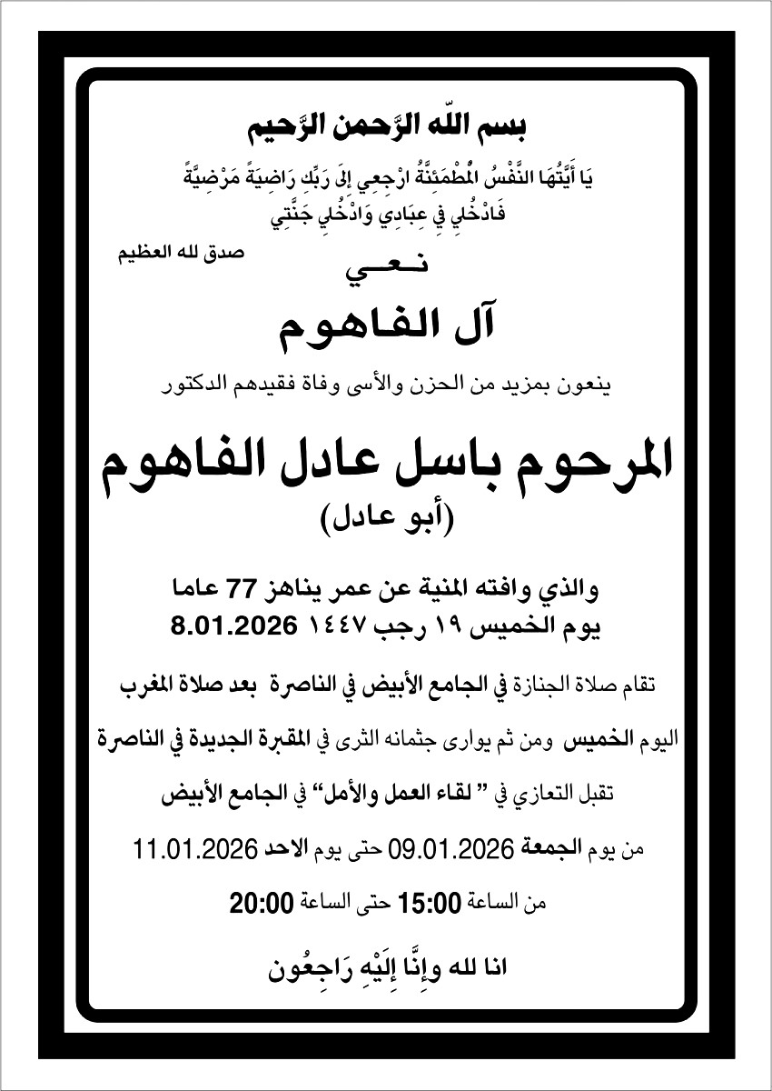 وبرحيل الدكتور باسل فاهوم (أبو عادل)، فقد المجتمع قامة طبية وإنسانية نادرة، تركت أثرًا طيبًا وبصمة صادقة ستبقى حاضرة في ذاكرة كل من عرفه وتعامل معه.