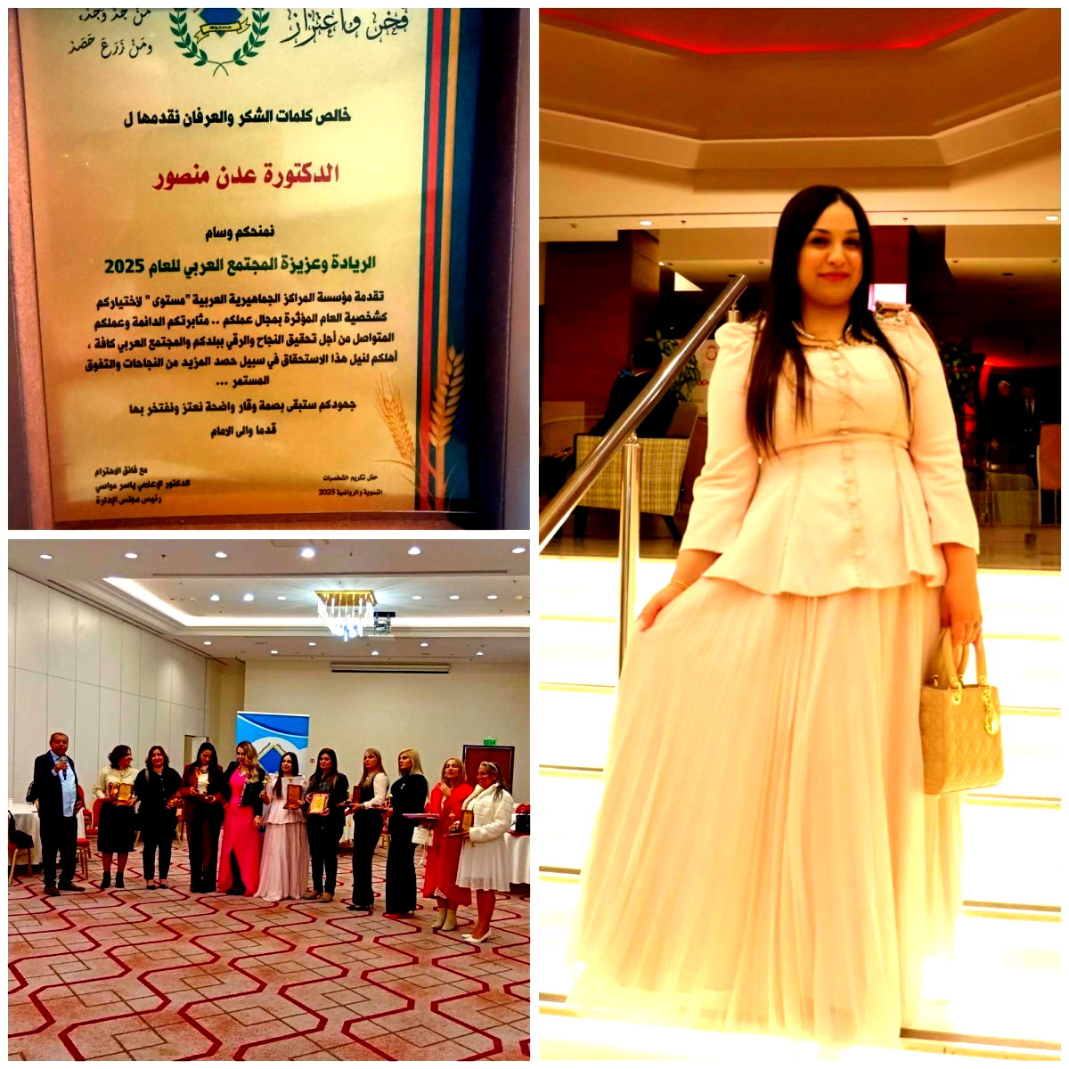 كرّمت مؤسسة المراكز الجماهيرية العربية "مستوى" الدكتورة عدن منصور. بعد اختيارها كشخصية العام المؤثرة، وبمثابرتها الدائمة من أجل تحقيق النجاح بالمجتمع العربيّ.