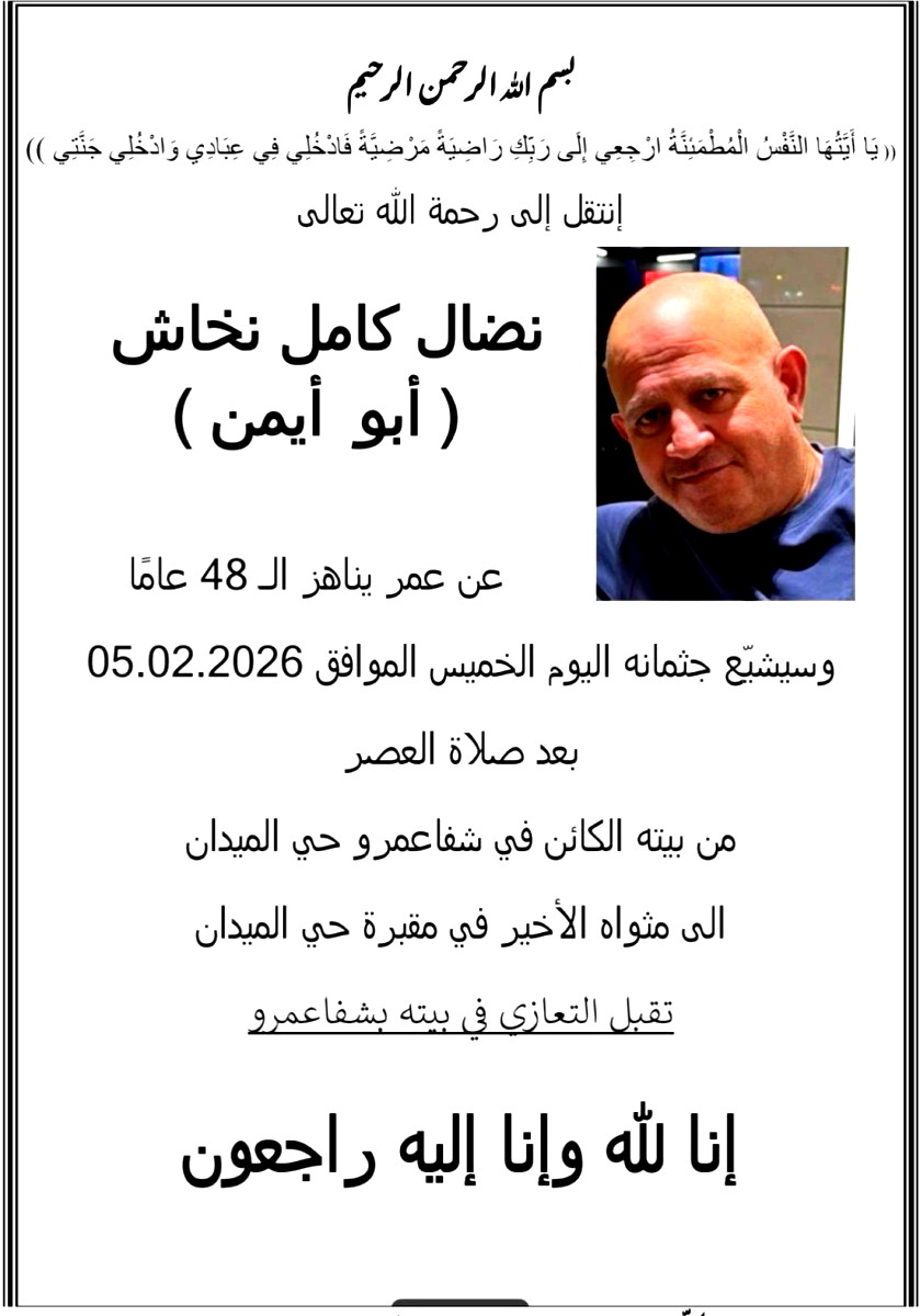 توفي اليوم الخميس في مدينة شفاعمرو، نضال كامل نخاش (أبو أيمن)، عن عمر ناهز الـ48 عامًا. وسيشيع جثمانه الطاهر اليوم 5.2.2026 بعد صلاة العصر، من بيته الكائن في حي الميادين، إلى مثواه الأخير في مقبرة حي الميادن.