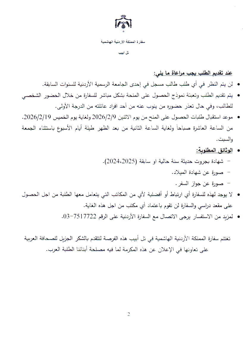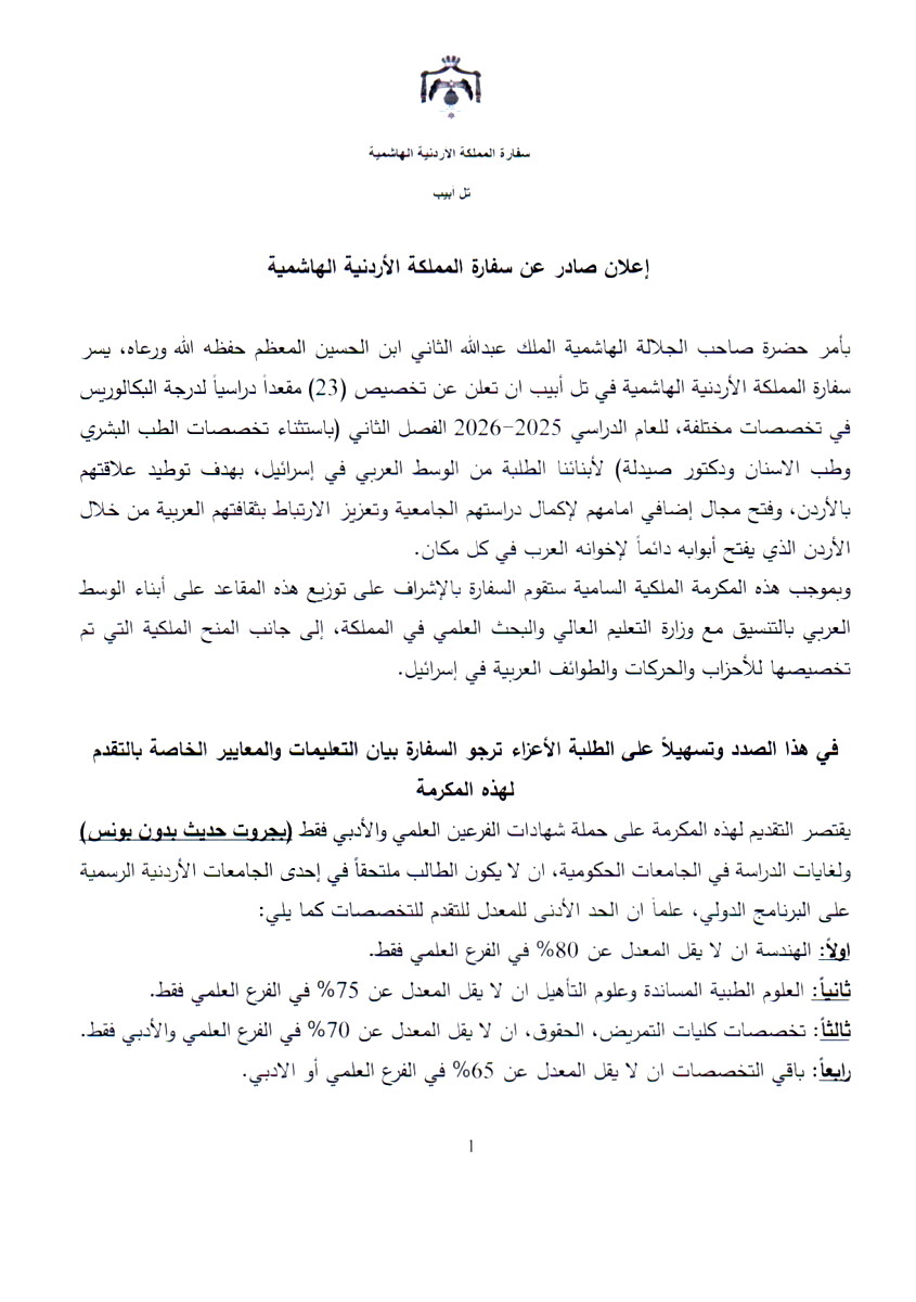 بأمر حضرة صاحب الجلالة الهاشمية الملك عبدالله الثاني ابن الحسين المعظم حفظه الله ورعاه، يسر سفارة المملكة الأردنية الهاشمية في تل أبيب ان تعلن عن تخصيص (23) مقعداً دراسياً لدرجة البكالوريس في تخصصات مختلفة، للعام الدراسي 2025-2026 الفصل الثاني (باستثناء تخصصات الطب البشري وطب الاسنان ودكتور صيدلة) لأبنائنا الطلبة من الوسط العربي في إسرائيل، بهدف توطيد علاقتهم بالأردن، وفتح مجال إضافي امامهم لإكمال دراستهم الجامعية وتعزيز الارتباط بثقافتهم العربية من خلال الأردن الذي يفتح أبوابه دائماً لإخوانه العرب في كل مكان.