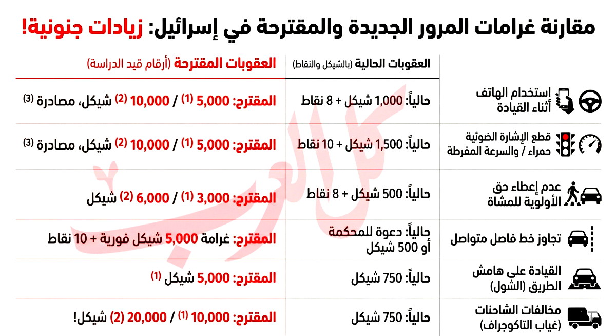 المقترح: 5,000 شيكل (للمرة الأولى) و 10,000 شيكل (للمرة الثانية)، ومصادرة المركبة في المرة الثالثة.