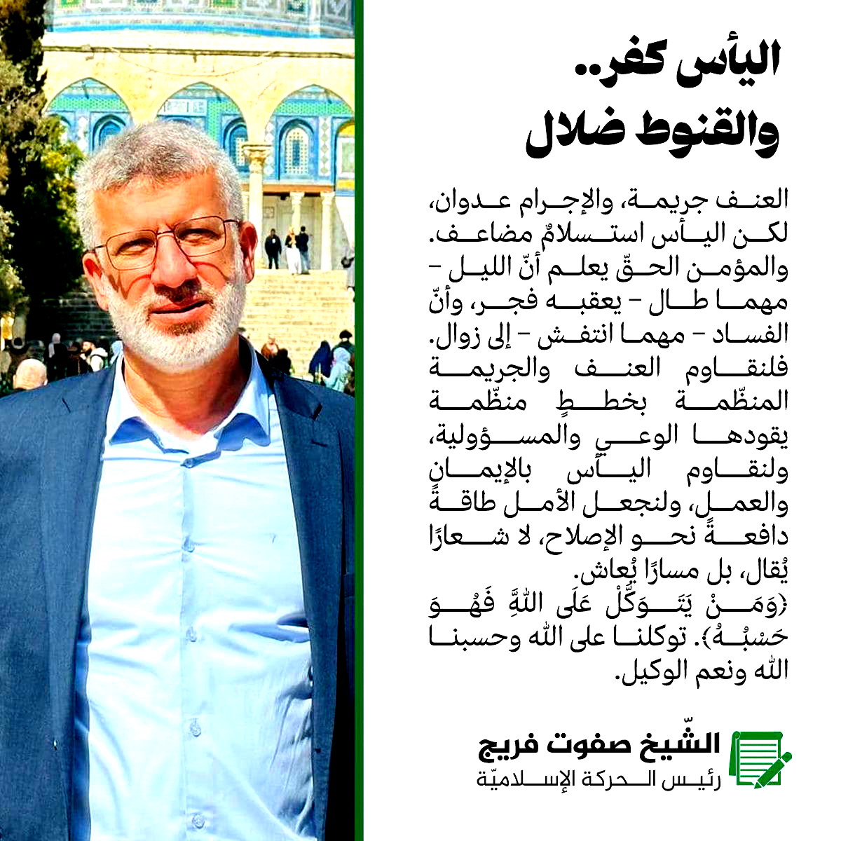 إن تحريم اليأس لا يعني إنكار الواقع، ولا التغافل عن الألم، بل رفض الاستسلام له. فالإيمان لا يدعو إلى التفاؤل السطحي، بل إلى أملٍ يُترجم عملًا: مبادراتٍ تربوية، وتكاتفًا اجتماعيًا، وخطابًا أخلاقيًا واضحًا، ومطالبةً جادّة بتطبيق القانون بعدلٍ وحزم.