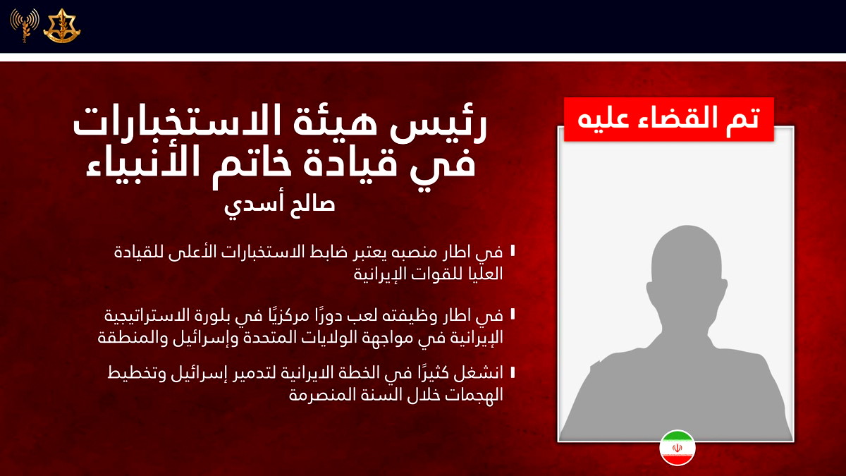 صلاح أسدي: رئيس شعبة الاستخبارات في قيادة الطوارئ، وضابط الاستخبارات الأقدم في القيادة العليا للقوات الإيرانية. لعب دوراً رئيسياً في صياغة الاستراتيجية ضد إسرائيل والولايات المتحدة، وانخرط بعمق في "خطة تدمير إسرائيل".