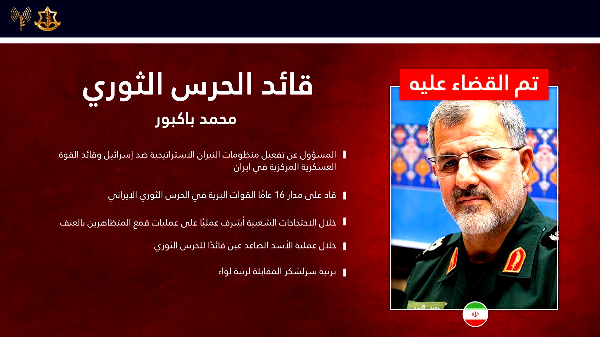 محمد باكبور: قائد الحرس الثوري (منذ عملية "عم كلافيا") وأحد قادة "خطة تدمير إسرائيل". قاد القوة العسكرية المركزية، وكان مسؤولاً عن المنظومات النيرانية الاستراتيجية ضد إسرائيل، ودعم وتوجيه المنظمات "الإرهابية" الوكيلة في مختلف الجبهات، إضافة إلى قيادته الفعلية للقمع العنيف للاحتجاجات الداخلية الأخيرة في إيران.