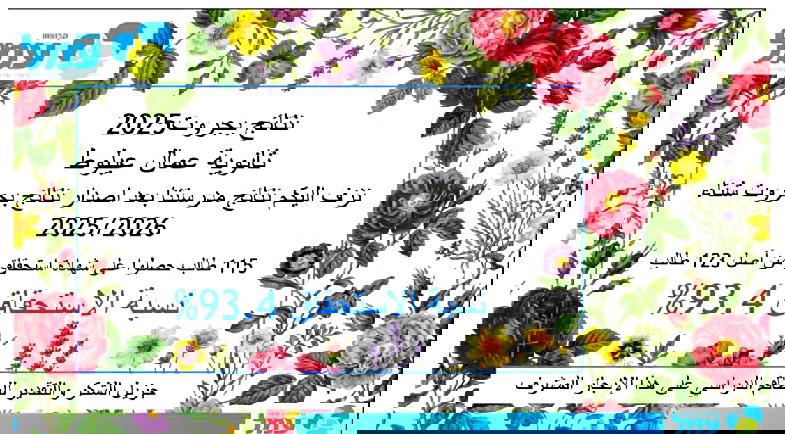 وصل بيان جاء فيه: "حققت مدرسة ثانوية عيلوط إنجازًا تعليميًا غير مسبوق بعد أن وصلت نسبة الاستحقاق لشهادة البجروت هذا العام إلى 93.4%، وهي أعلى نسبة تسجلها المدرسة منذ تأسيسها، في محطة تاريخية تعكس الجهود الكبيرة التي بُذلت من قبل الطاقم التربوي والطلاب".