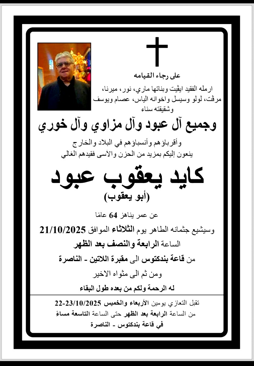 انتقل إلى رحمته تعالى في الناصرة، كايد يعقوب عبود (أبو يعقوب) عن عمر ناهز الـ64 عامًا. وسيشيّع جثمانه الطّاهر اليوم الثّلاثاء الموافق 21.10.2025 السّاعة الرّابعة والنصف من قاعدة بندكتوس إلى مقبرة اللاتين في المدينة.