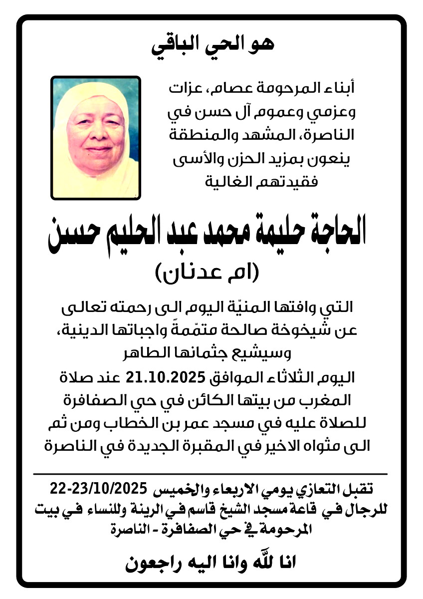 انتقلت إلى رحمة الله تعالى في الناصرة، الحاجة حليمة محمّد عبد الحليم حسن (أم عدنان). وسيشيّع جثمانها الطّاهر اليوم الثّلاثاء، عند صلاة المغرب من بيتها الكائن في حيّ الصفافرة للصلاة عليها في مسجد عمر بن الخطاب، ومن ثم إلى مثواها الأخير في المقبرة الجديدة.