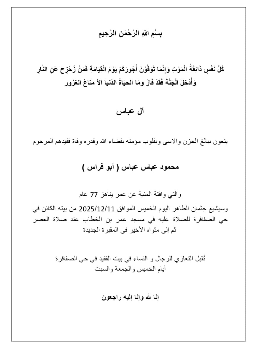 توفي في مدينة الناصرة، محمود عباس عباس (أبو فراس) عن عمر ناهز الـ77 عامًا. وسيشيع جثمانه الطاهر اليوم الخميس 11.12.2025 من بيته الكائن في حي الصفافرة، للصلاة عليه في مسجد عمر بن الخطاب عند صلاة العصر، ثم إلى مثواه الأخير في المقبرة الجديدة.