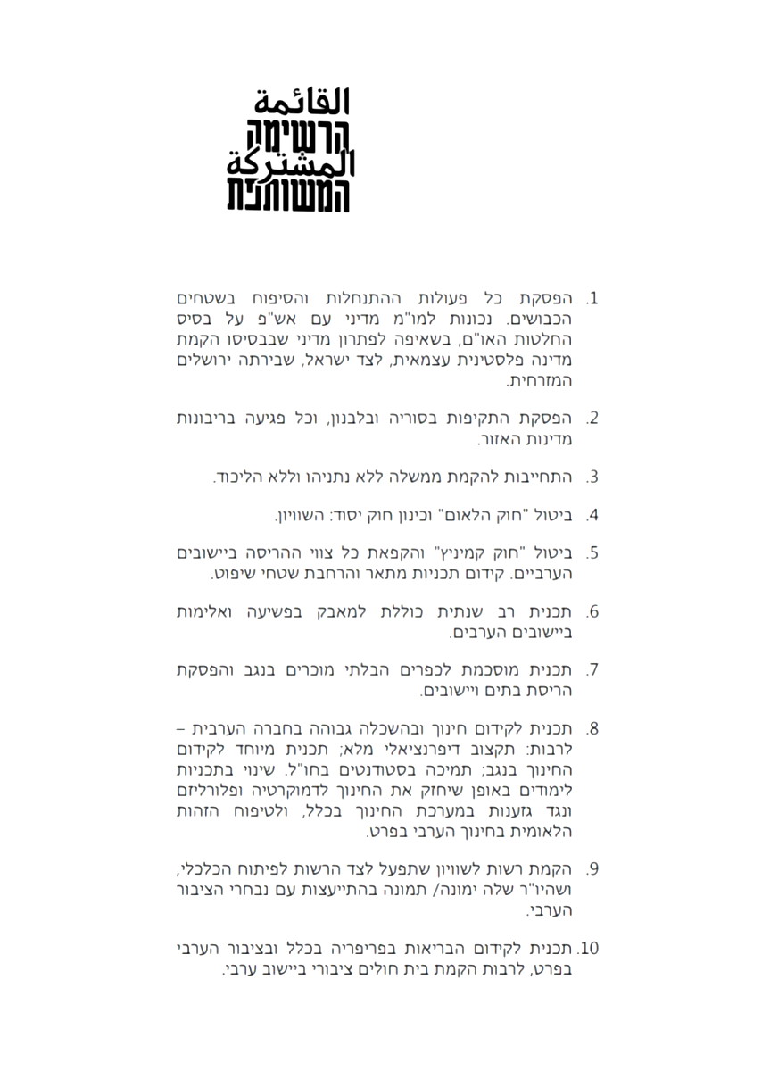 وانطلاقًا من حرصنا على تثبيت الحقيقة التاريخية، نضع أمام جماهير شعبنا الوثيقة الرسمية للمطالب التي قدمتها القائمة المشتركة آنذاك، والتي تقطع الشك باليقين حول مطالنا القومية والوطنية آنذاك: