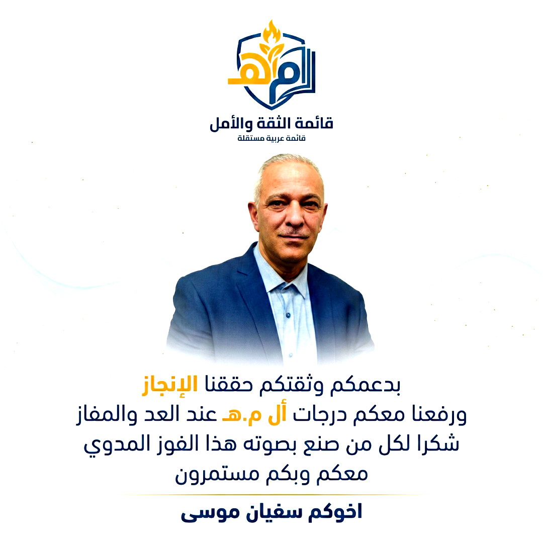 حققت قائمة (م هـ) "ثقة وأمل"، بقيادة المربي سفيان موسى، فوزاً كبيراً وإنجازاً مشرفاً في انتخابات نقابة المعلمين، بحصولها على 10,342 صوتاً على مستوى الدولة.