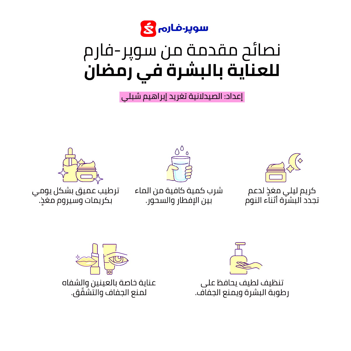 تقدّم لكم صيدلانية سوبر-فارم تغريد إبراهيم شبلي، صاحبة امتياز فرع سوبر-فارم في بيغ فاشن يركا، مجموعة من النصائح والمعلومات المهمة للحفاظ على بشرة صحية خلال شهر رمضان وفي الفترة الانتقالية.