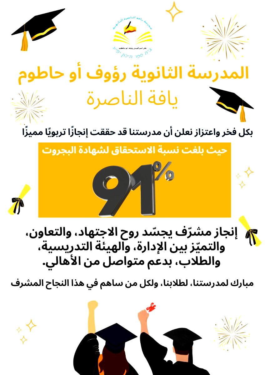 وصل بيان لموقع العرب جاء فيه: "بكل فخر واعتزاز، نعلن أن المدرسة الثانوية رؤوف أبو حاطوم في يافة الناصرة قد حققت إنجازًا تربويًا مشرّفًا، بحصولها على نسبة استحقاق لشهادة البجروت بلغت 91%، وهو إنجاز يعكس روح المثابرة، والإصرار، والعمل الدؤوب الذي يميّز أسرة المدرسة".